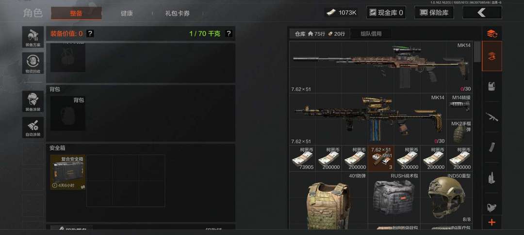 纯科恩币1073k爆率高有个2×3格保险箱仓库里有两把妹控随便用带枪皮的老板请租号同行勿扰租3赠2