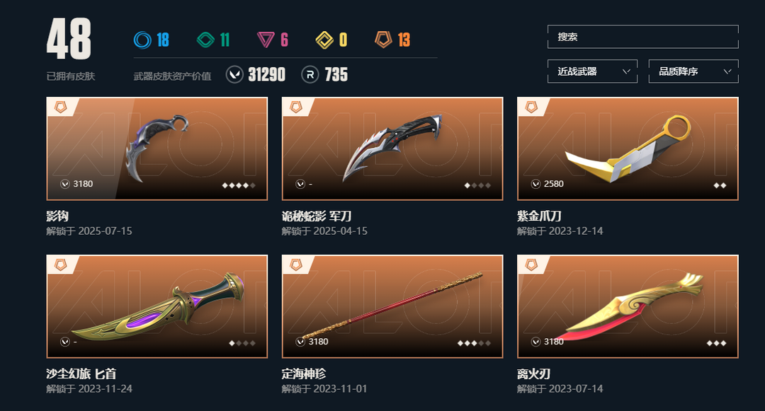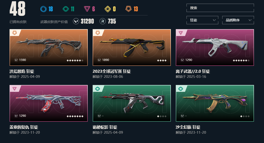 装备描述:刀皮:离火刃、紫金爪刀,金箍棒、掠夺爪 AK:23冠军、盖亚、离子、流脓 M4:掠夺、光明哨兵 戍卫:噬影者 标配:25EDG 鬼魅:掠夺 正义:毁灭骑士、西部未来 【资产2500+,警署朋友开挂必找】 若异地请通知秒解冻
