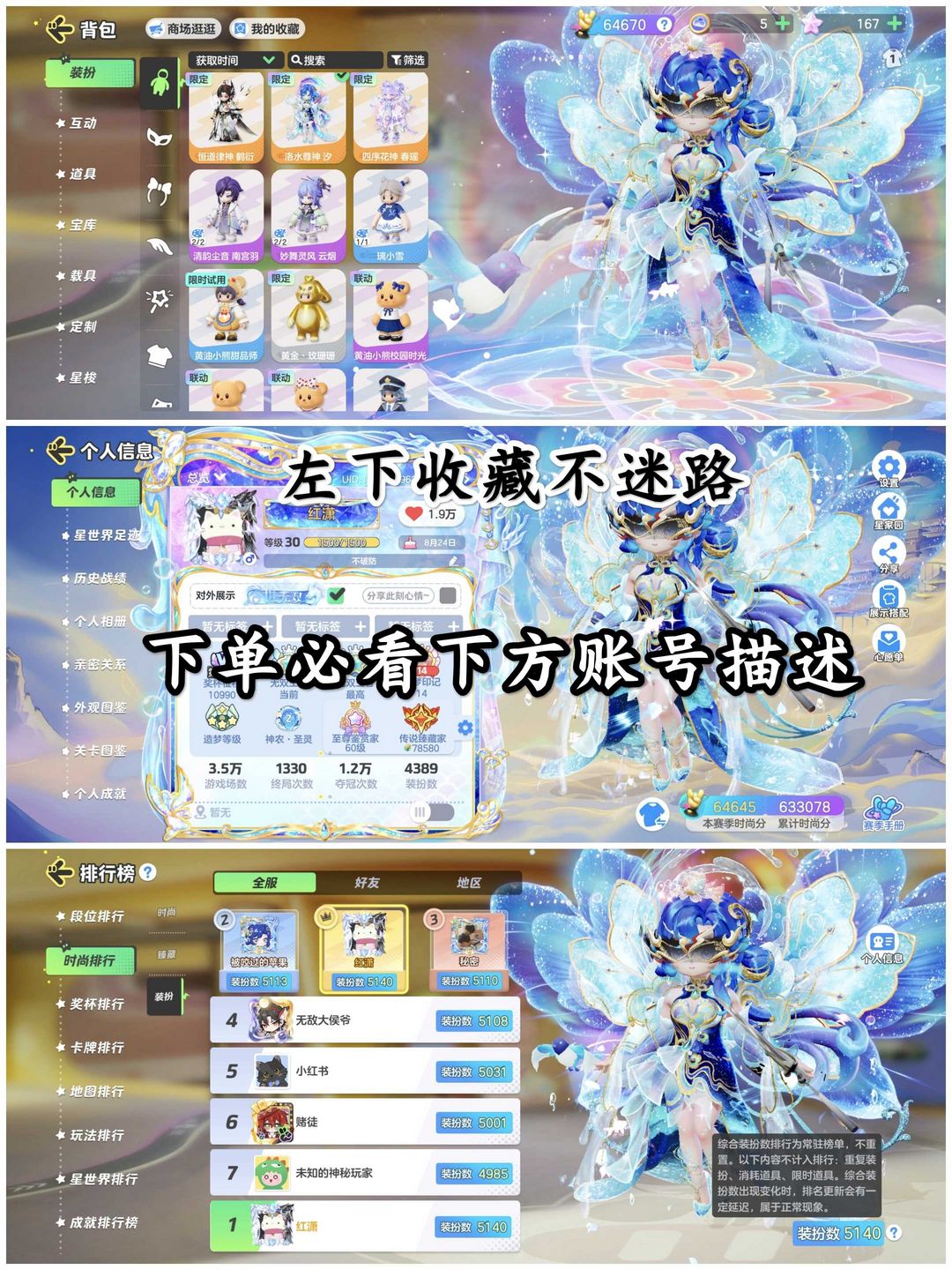 装备描述:⭐️【前排求好评,撤单需写原因,非合理撤单(描述不符,下单后又撤单、撤单后在线)用货币、导致禁语音或打字、差评、逃跑导致信誉分不足,会被拉黑。真心不想拉黑任何人,为了大家体验请珍惜】 ⭐️禁打字12月13日 ⭐️【时尚-装扮排行全服第一,最全皮肤/全模式装扮/最高装扮数×最高鉴赏等级】 ⭐️【(昵称搜[红潇小号]看头像或登录看好友列表置顶小号头像),有问题可反馈处理】