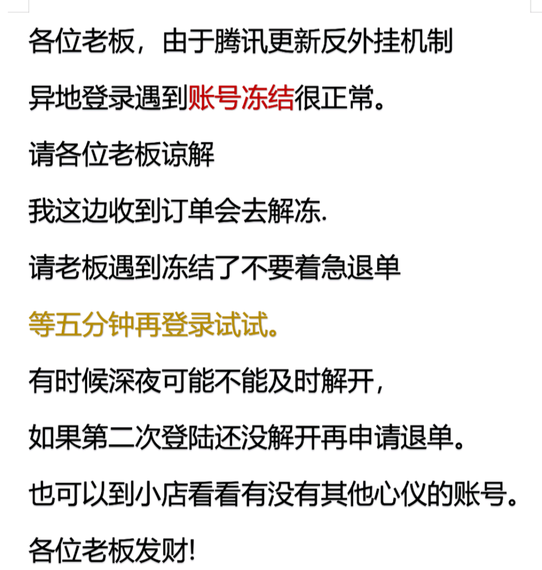 装备描述:人❤️0❤️脸❤️加绿zhang123456hhees 各位老板,提交异常过后两分钟在登录就可以了,由 于腾讯更新反外挂机制异地登录遇到账 号冻结很正常。请各位老板谅解我这边收到订单会去解冻,请老板遇到冻结了不要着急退单等五分钟再登录试试。有时候深夜可能不能及时解开,如果第二次登陆还没解开再申请退单。祝各位老板发财!