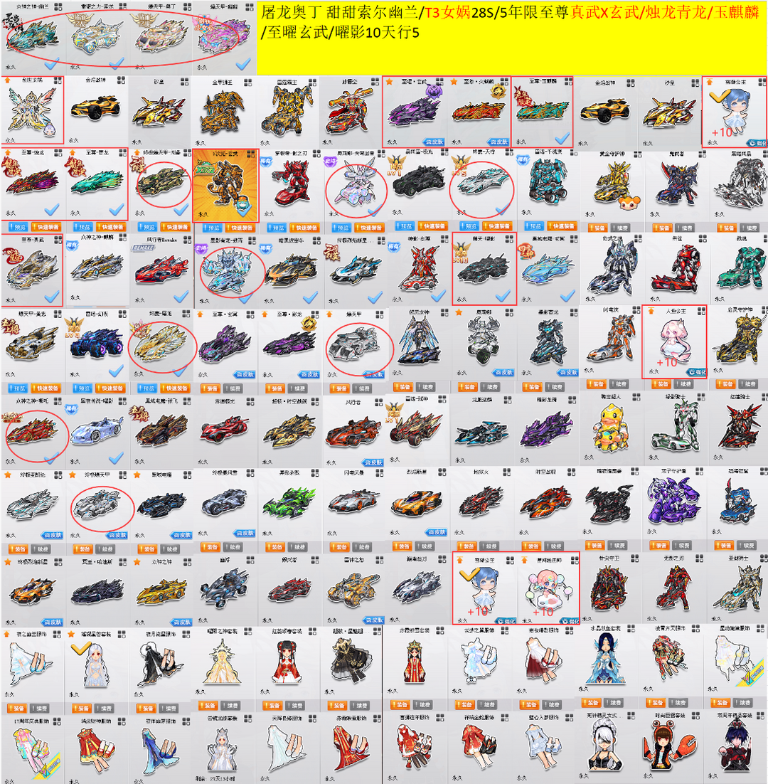 装备描述:M3榴弹/爆天甲 甜甜/屠龙奥丁索尔幽兰/超核玩家/18w魅力/钻7黄7/女衣柜/终麦-屠龙/三四满改T3创世女娲=5年限双四满改蛇限至尊真武=X次元玄武=双四满改龙限至尊烛龙/至尊青龙=双四满改至尊玉麒麟=满改至曜玄武=满改爆天曜影10阶/超核·时空战舰/毁灭者/异形杀戮/金焰战神/赤道极光/雷神之怒/闪电风暴/烈焰新星/地狱火/幽浮/终极暴风雪/暗影龙骑/巅峰战刀/龙胆逆鳞/沙皇/时空战舰/冥王·哈迪斯 终麦天行5阶=奥莉娜-天穹战音5阶/敖丙 5 阶 10 T2 纪元女神雷霆霸主黄金守护神鬼武者金甲狮王孙悟空黑暗风暴 孔明/刘备/宙斯/麒麟/千机变/剑尊/玄冥/张飞/哪吒/黄忠/风 xing 者 remake/幻夜4/ 竞速宠 153A 卧龙雷诺/魔王雷诺/地狱雷诺/电玩雷诺/大圣雷诺/飞虎雷诺/羊年雷诺/战争雷诺/钢铁雷诺/普雷/超时空穿梭者/星光穿梭者/穿梭者影之刃/满战勋 A 车/4 小龙/变形销魂/绿箭销魂/银电销魂/烈焰销魂/寒冰战士/烈焰战车/罗刹/指挥官/猛禽/幻鳞猛禽/幻影绝迹/耀世 雪凝/星河/人鱼/梅灵/子鼠/牛牛等+10 可跑排位