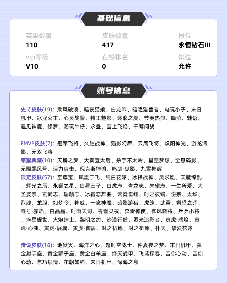 限制: 租号8次及以上 | 撤单率<20%才可租用此帐号装备描述:|||||||||喜欢本账号请点 ☆收藏☆ 方便下次租用,谢谢光临惠顾||||||||| 本游戏账号,英雄多,皮肤多。,感受典藏皮肤带来的6||孙尚香 杀手不太冷||孙悟空 全息碎影||武则天 倪克斯神谕||夏侯惇 无限飓风号||小乔 天鹅之梦,等等 注意事项: A.游戏过程中请不要恶意挂机或者不文明发言B.恶意挂机、顶号等行为将被拉黑无法再次下单C.进入游戏后中途请勿退出登陆,否则无法再次上号D.部分账号由于异地登录可能会出现密码错误提示,通常再尝试5-6次后可上号 |||||||||>喜欢本账号请点 ☆收藏☆ 方便下次租用,谢谢光临惠顾|||||||||