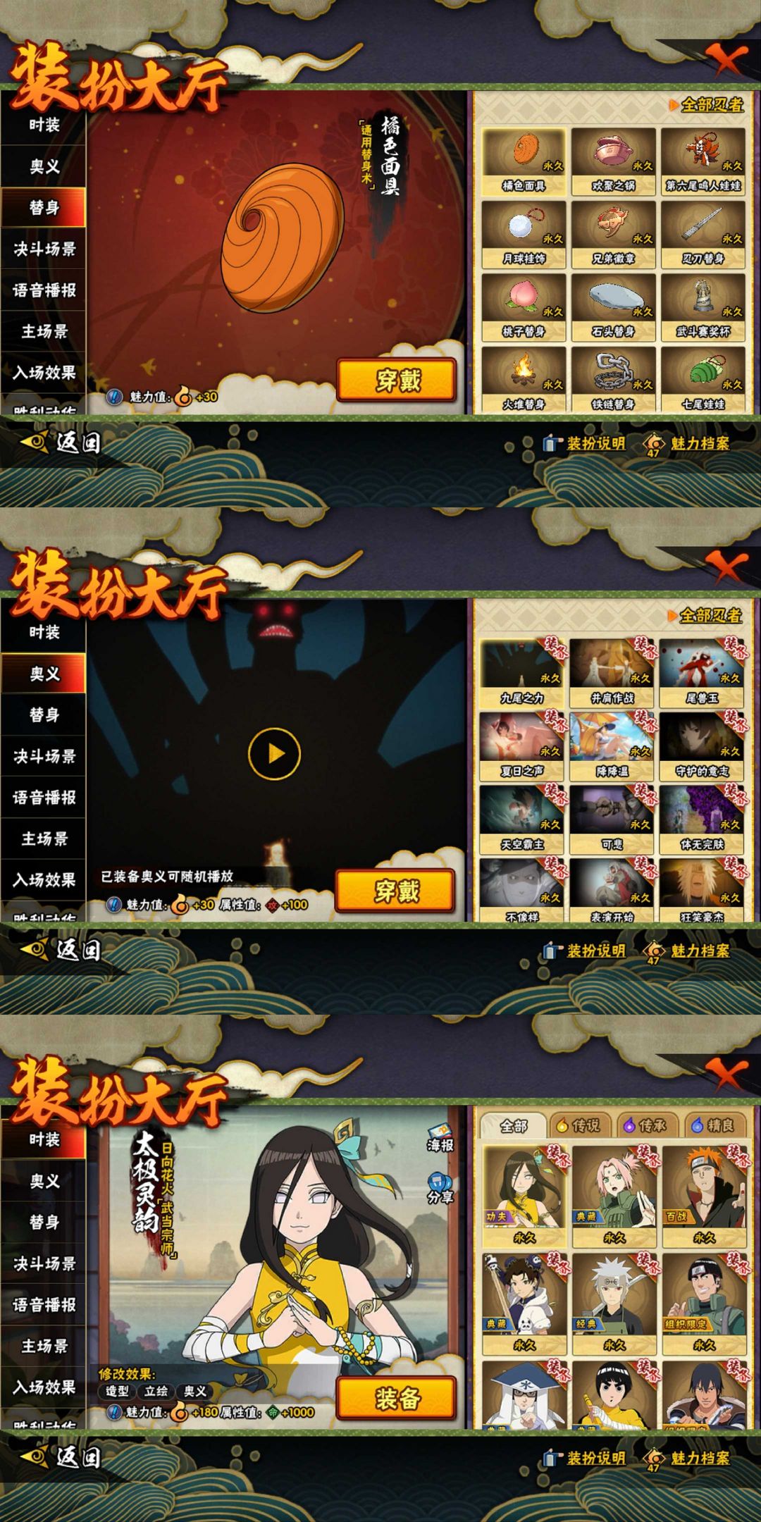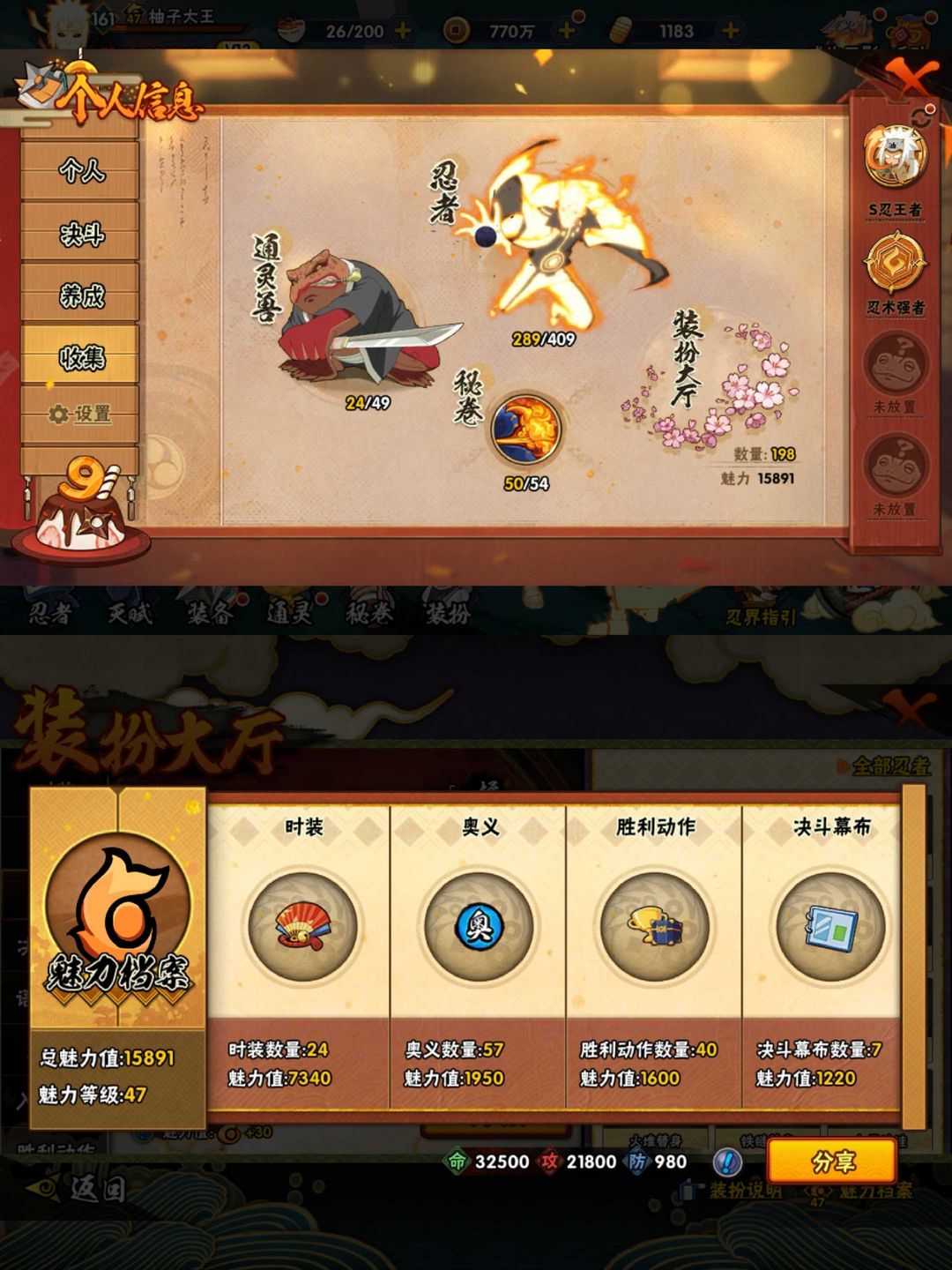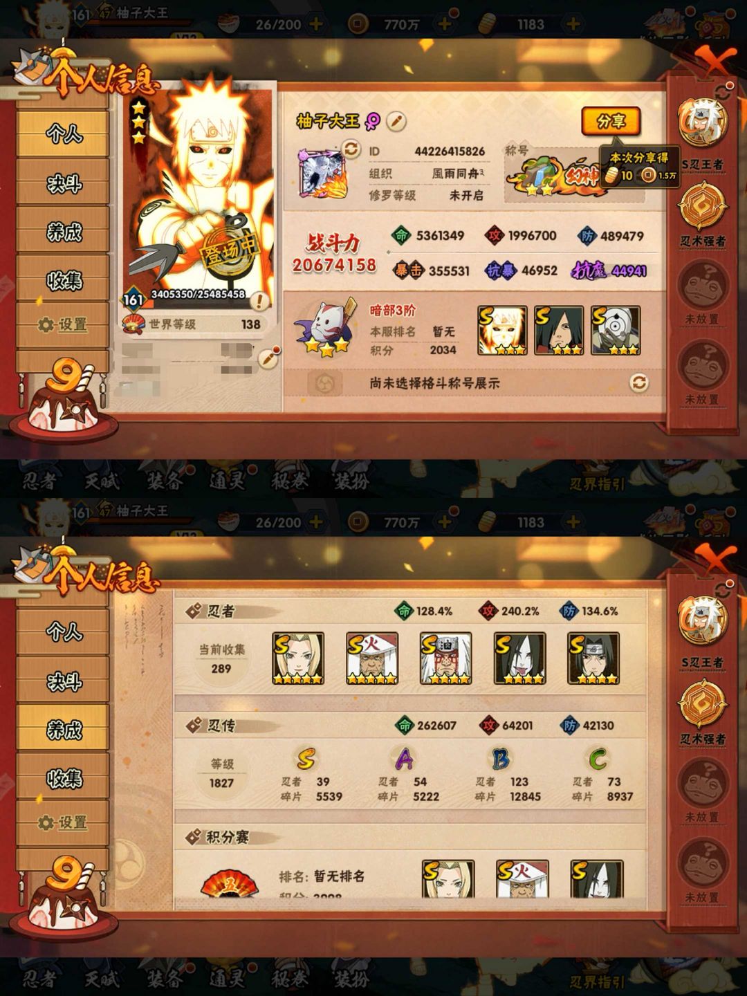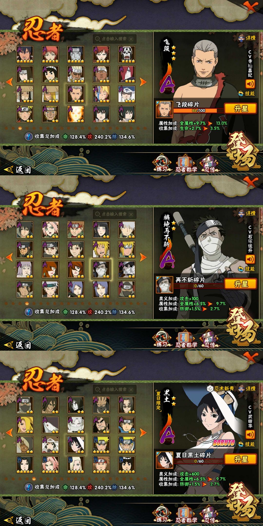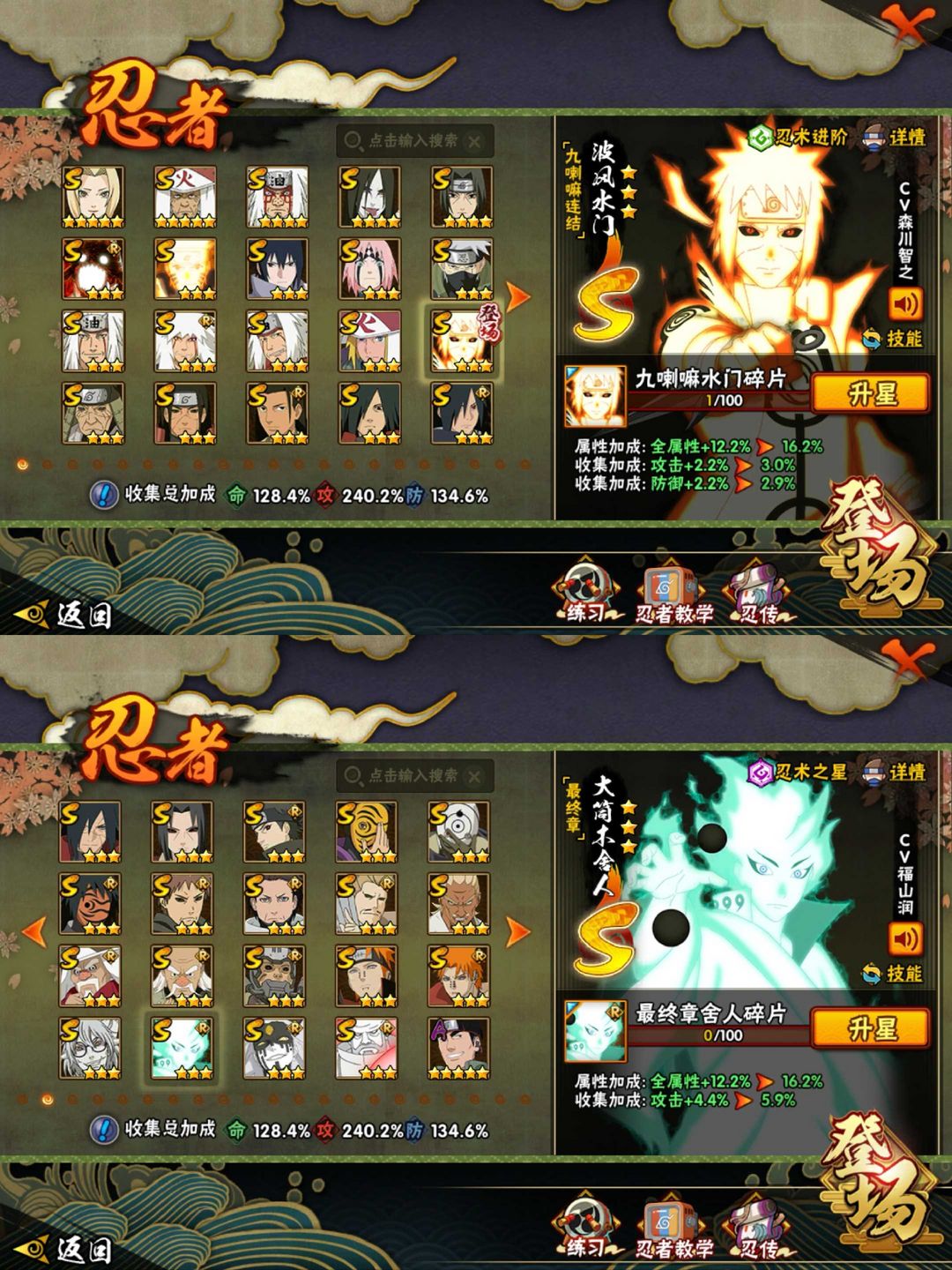 装备描述:S忍者:【大野木 「忍界大战」,漩涡鸣人 「九喇嘛连结」,千手柱间 「木叶创立」,大筒木舍人 「最终章」,宇智波佐助 「永恒万花筒」,宇智波斑 「木叶创立」,千手柱间 「秽土转生」,大筒木桃式,罗砂 「四代目风影」,宇智波鼬 「秽土转生」,自来也 「舞之豪杰」,佩恩·天道 「超」,药师兜 「仙人模式」,“宇智波斑” 「白面具」,半藏 「秽土转生」,漩涡鸣人 「暴怒·第六尾」,烈斗 「初代目风影」,宇智波止水 「须佐能乎」,艾 「忍界大战」,自来也 「传说中的三忍」,波风水门,大蛇丸,大野木 「三代目土影」,纲手,鬼灯幻月 「二代目水影」,佩恩 「天道」,神秘面具男,自来也 「仙人模式」,宇智波斑,宇智波鼬 「须佐能乎」,猿飞日斩,猿飞日斩 「秽土转生」,自来也,神秘面具男 「红夜之刃」,宇智波斑 「秽土转生·解」,春野樱 「忍界大战」,大筒木金式,波风水门 「九喇嘛连结」,旗木卡卡西 「须佐能乎」】 A忍者:【桃地再不斩 「秽土转生」,达鲁伊 「五代目雷影」,波风水门 「青年」,土台 「忍界大战」,千手扉间 「漂泊武士」奇拉比 「忍界大战」,宇智波止水 「新春限定」,黑土 「四代目土
