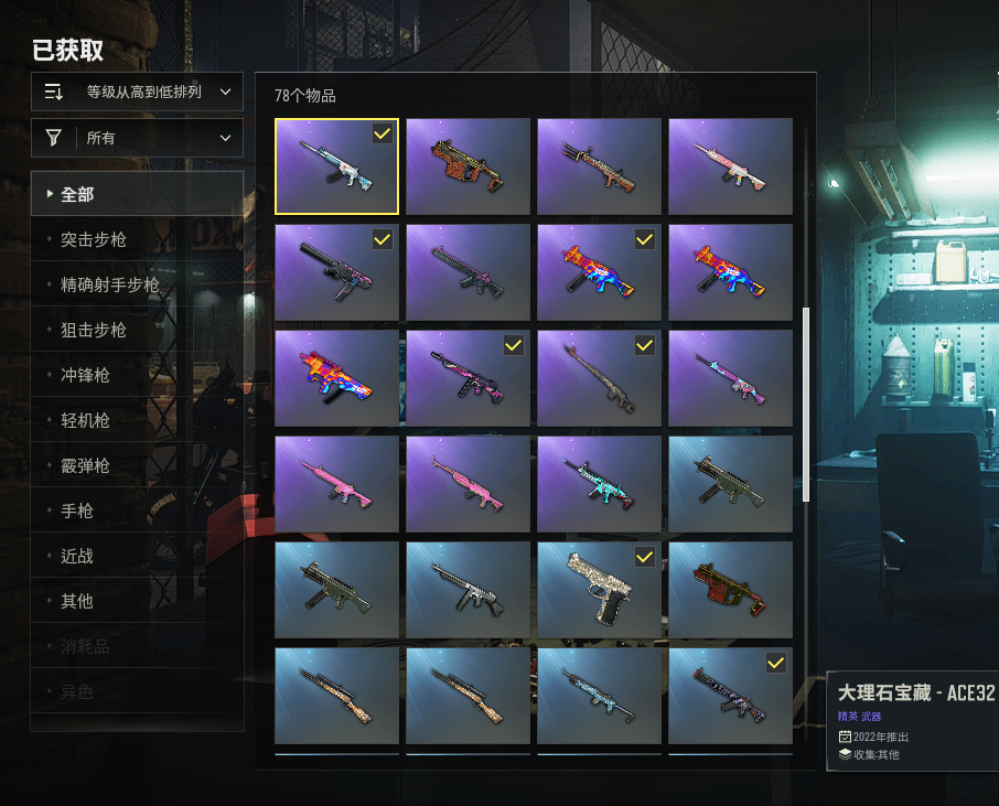 ④级妖魔之触ACE✅雪国风光M4✅湮灭M762✅竞速之道AKM✅镀金SKS✅大理石SLR✅幸运骑士M